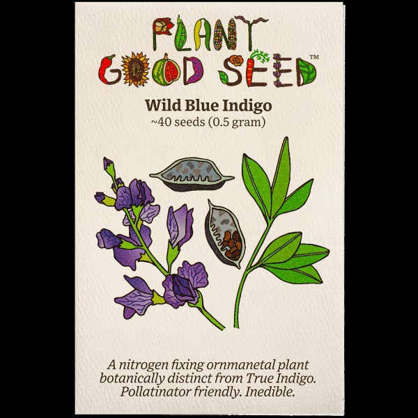 Wild Blue or Blue False Indigo (Baptisia australis), is a pea family perennial that is grown ornamentally or as a niche nitrogen fixer. Seed pods are really beautiful too, and dry on the plant and make a fun rattling noise. The spent stalks and seeds are sometimes used in flower arrangements. Botanically distinct from True or Dye Indigo (Indigofera tinctoria). Perennial that can flower in its first year if seeded in late winter/early spring; will overwinter in climate zones 3 and above and reach 2-3 feet in its second year. Plant photo licensed through Creative Commons.
