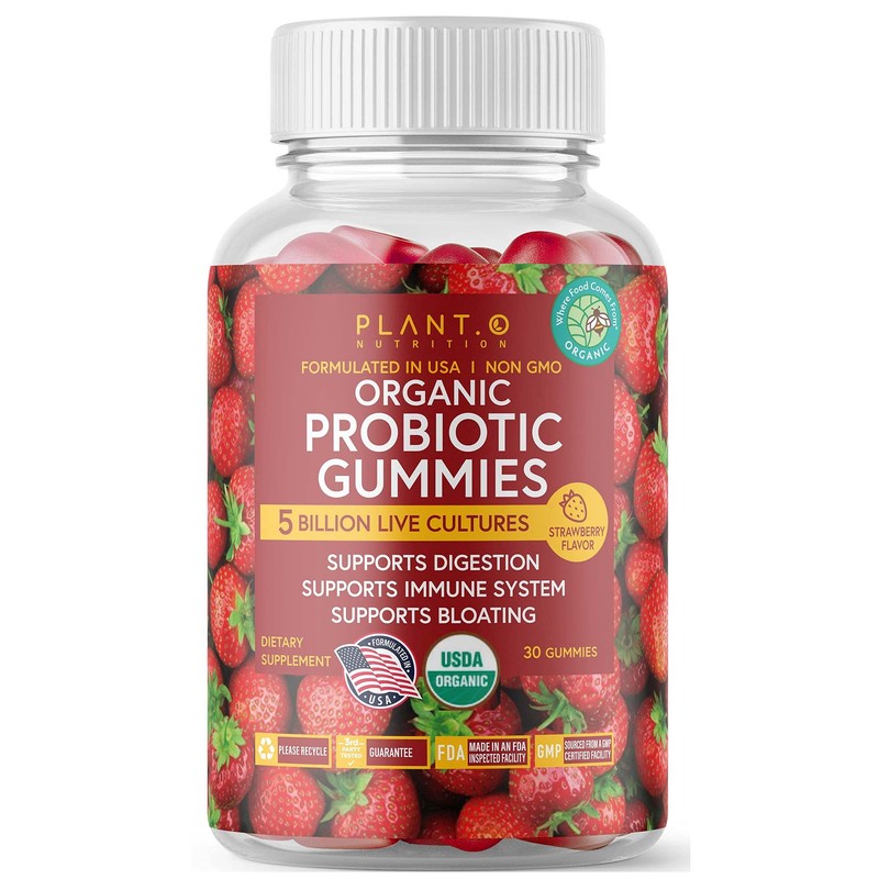 PLANT.O NUTRITION Plant.O Organic Probiotic Gummies for Women, Men & Kids [5 Billion CFUs USDA Certified] Help Support Digestion, Bloating, Constipation & Immune System, Strawberry Flavor, 30 Chewable Probiotics