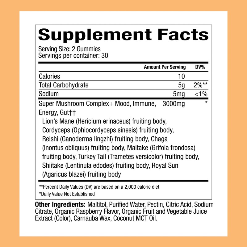 - Say no to caffeine or chemicals - Our cordyceps mushroom gummies are safety tested. This vegan lion's mane mushroom supplement is free from GMOs, gluten, corn syrup, dyes, or gelatin. Enjoy 2 gummies per day with a heavy dose of 2500 mg per serving. We source US-cultivated functional mushrooms.