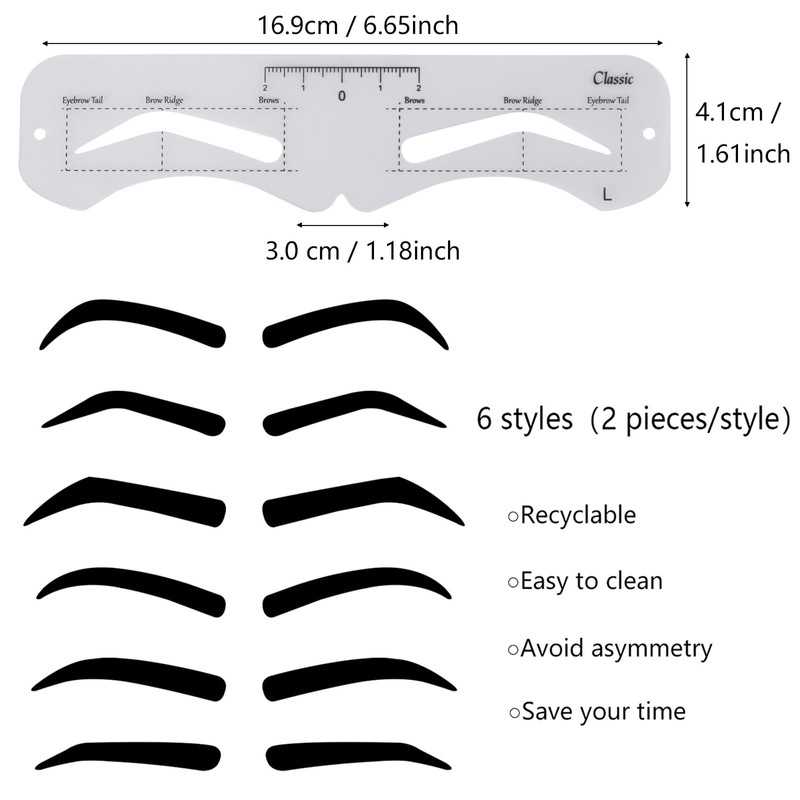 - Plantilla reutilizable para cejas con 6 estilos diferentes (un total de 12 piezas).