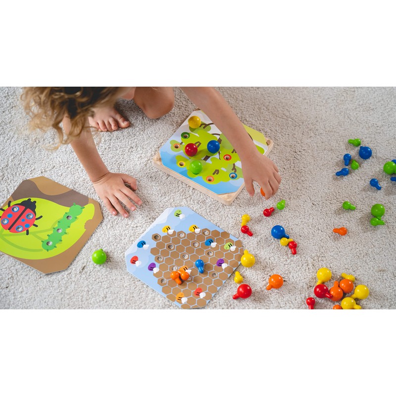 • Includes: wooden board, pattern card, wooden pegs (5 colors)