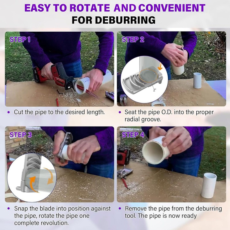 - SUITABLE FOR VARIOUS PIPELINE PROJECTS: This versatile tool can deburr six different pipe sizes ranging from 1 1/4in to 4in(1 1/4in, 1 1/2in, 2in, 2 1/2in, 3in, 4in) for PVC, CPVC, ABS, PP and PE pipes. Whether you're a professional plumber or a DIY enthusiast, this deburring tool is a must have in your toolbox