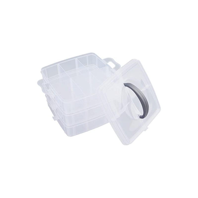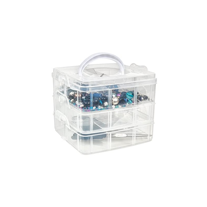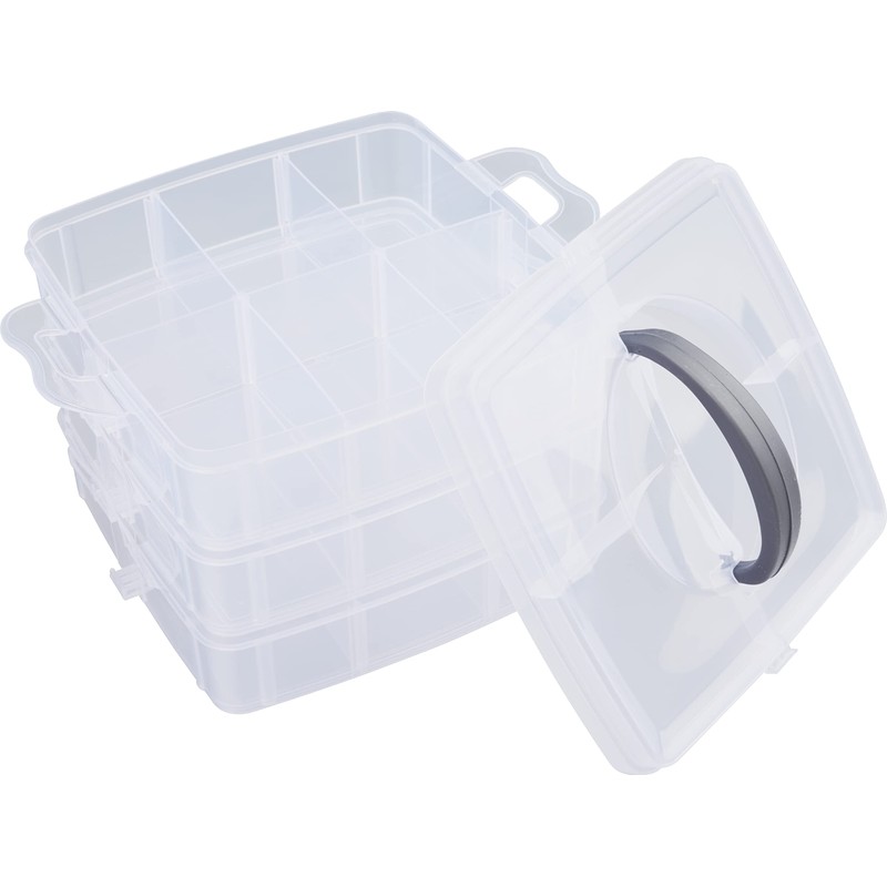 This practical organiser system consists of 3 assortment boxes, which can be connected to each other using a click system. The individual boxes are divided into 6 compartments. The dividers can also be removed individually so that even larger things can be stored. A retractable handle is integrated into the lid. The size of each box is approx. L 15.5 x W 15.5 x H 4.5 cm and the complete sorting box has a dimension of approx. L 15.5 x W 15.5 x H 13 cm.