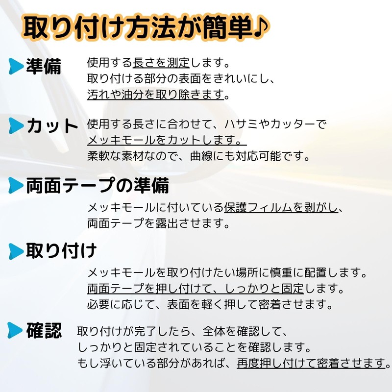 【Examples of Installation Location】The plating molding is highly versatile and can be installed in a variety of locations. Examples include windows, mirrors, bumpers, roofs, front grilles, body sides, interior panel and more. No matter where you install it, you can expect a luxurious look and style.
