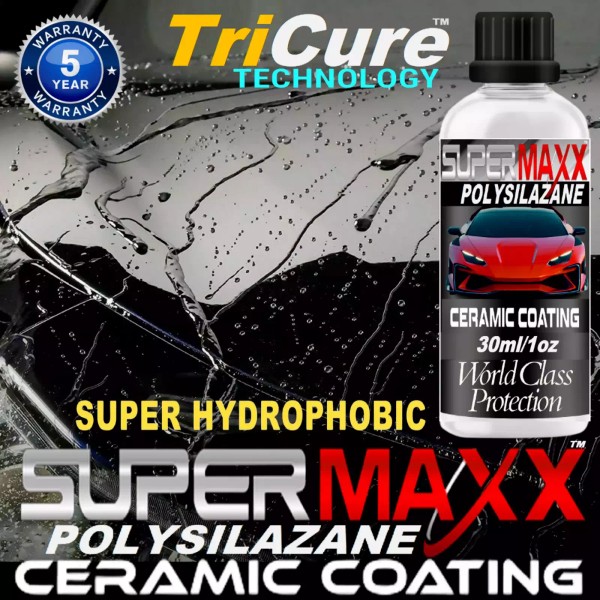 SUPERMAXX Polysilazane Ceramic Car Coating is a Professional Grade Polysilazane silicon-based polymer containing alternating silicon and nitrogen atoms. When used on most surfaces Polysilazane converts into Super Ceramics, such as Si3N4, SiON, SiCN, SiCNO, or SiC. Polysilazanes are used as Super Ceramic Coatings on Auto, Marine, RV, and Aviation surfaces with long-term benefits, and to protect and maintain a new surface look.