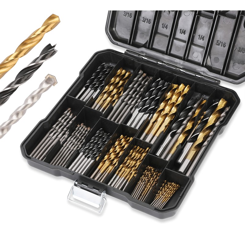 - All in One: Includes 88 pcs titanium drill bits, 26 pcs masonry drill bits, and 26 pcs brad point bits. Titanium Twist Drill Bit: The 135° fast cutting point and Titanium coated surface prevent rusting, which increase the hardness of the drill bit and reduces heat buildup, making the twist drill bit more wear-resisting for longer life. Masonry Drill Bits: Constructed from high-speed steel. Brad Point Bits: Constructed from high-speed steel.