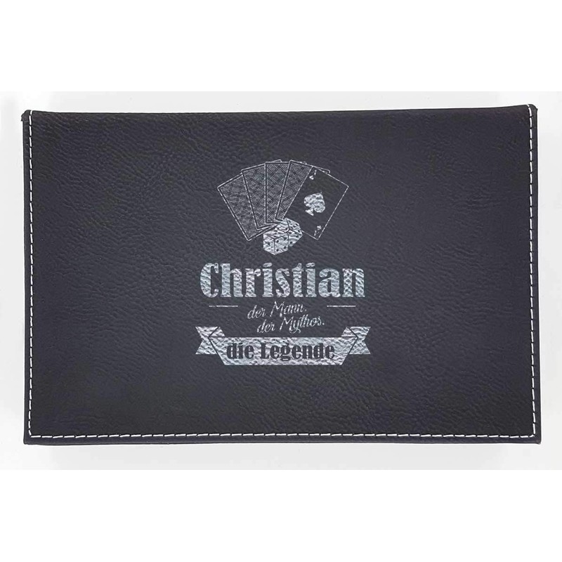 A very personal gift for gamers and poker faces: the playing card set "Christian (or desired name) - the man, the myth, the legend" in the faux leather box impresses with its particularly elegant look, the engraving appears silver on the black faux leather surface. Personalised with your desired name. The playing card set includes 110 cards with 6 jokers (French leaf) and 5 dice. The box with artificial leather surface Is 200 x 130 x 34 mm in size and equipped with a high-quality laser engraving. Trendy, humorous and useful gifts for everyone – this is also available dialect-free and nationally at "die stadtmeister". With us you will find a funny gift for any occasion and for any occasion: as a birthday gift, farewell gift, funny Mitbringsel for the grill party or as a gift for men, etc.