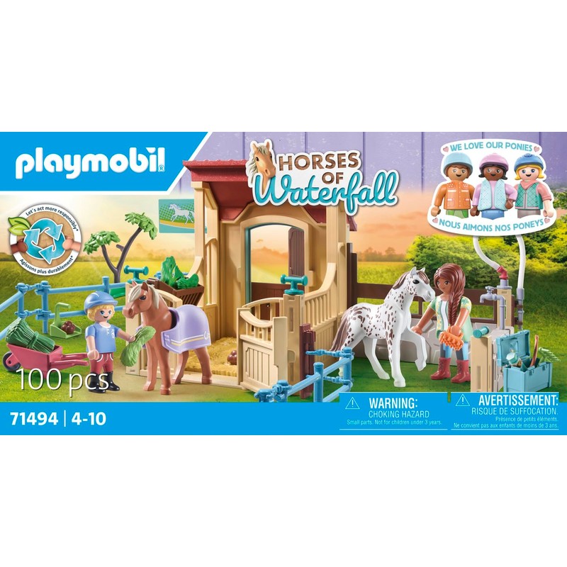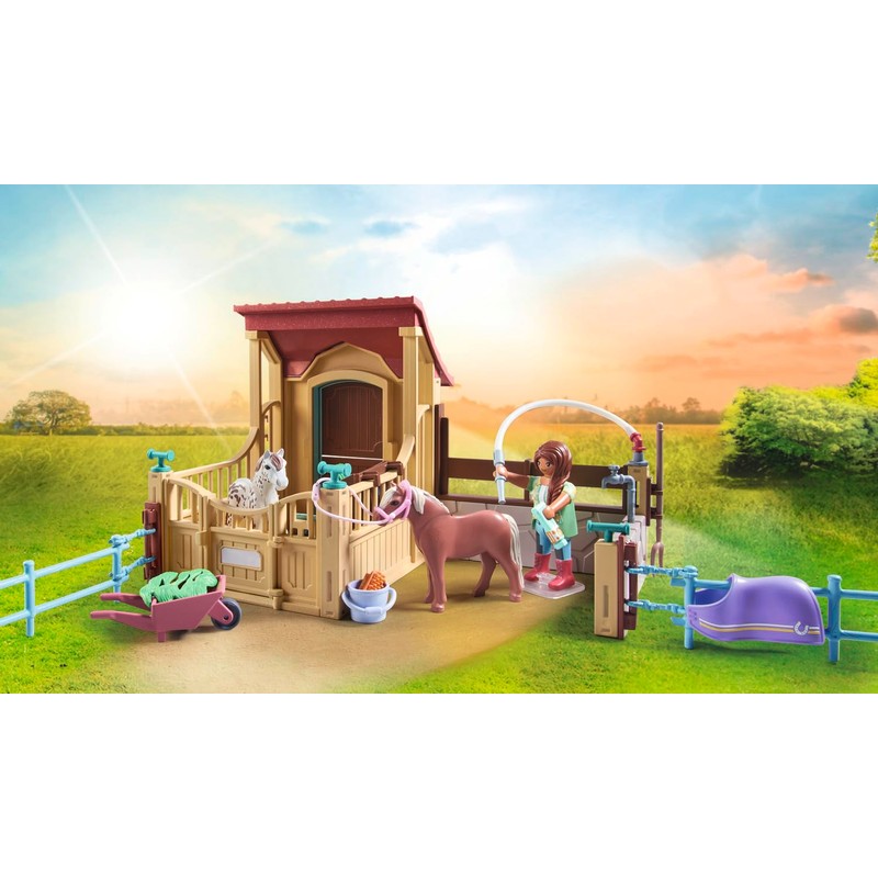 - El set incluye un establo PLAYMOBIL con figura PLAYMOBIL, dos ponis, una caja para caballos con área de lavado, elementos de valla y numerosos extras para el cuidado de los caballos
