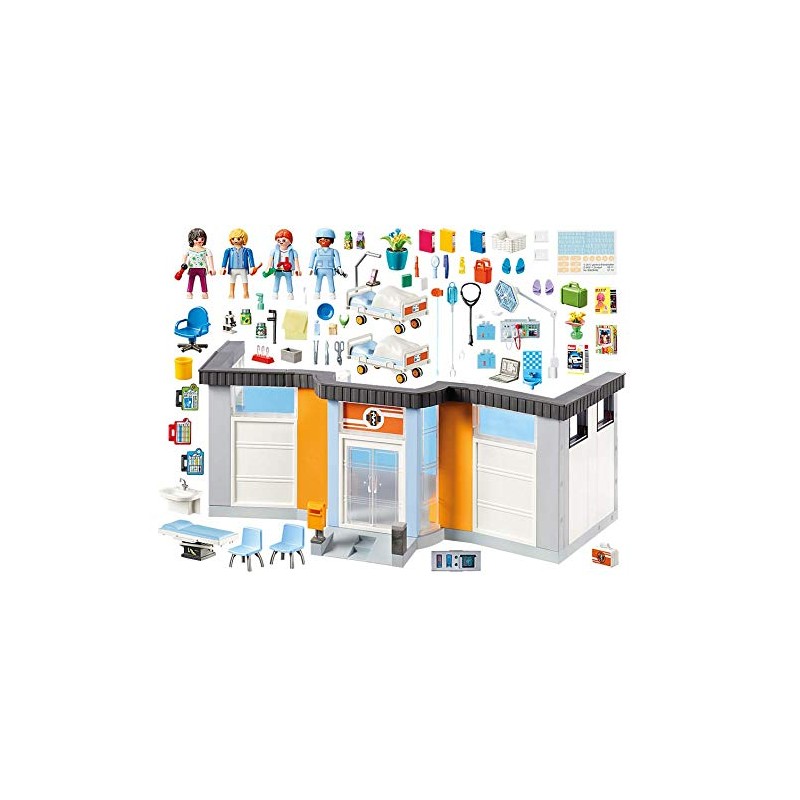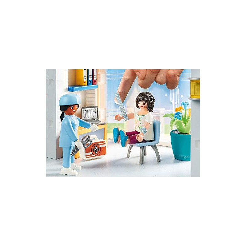 - Set includes four figures, furnished hospital wing, two rolling patient beds, exam bed, stethoscope, medical charts and tools, laptops, magazines, test tubes, microscope, bandage stickers, and many other accessories