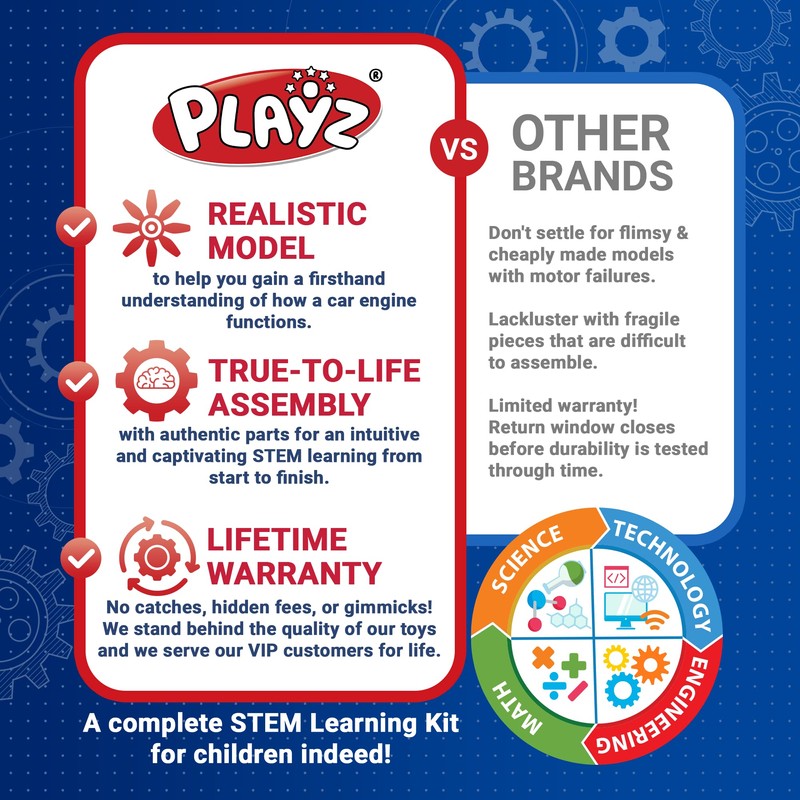 • DEVELOP THEIR CRITICAL THINKING SKILLS: Playz Kids DIY Toy V8 Combustion Engine Model Kit will encourage young boys and girls to expand their creativity, think logically, and even refine their motor skills all at once!