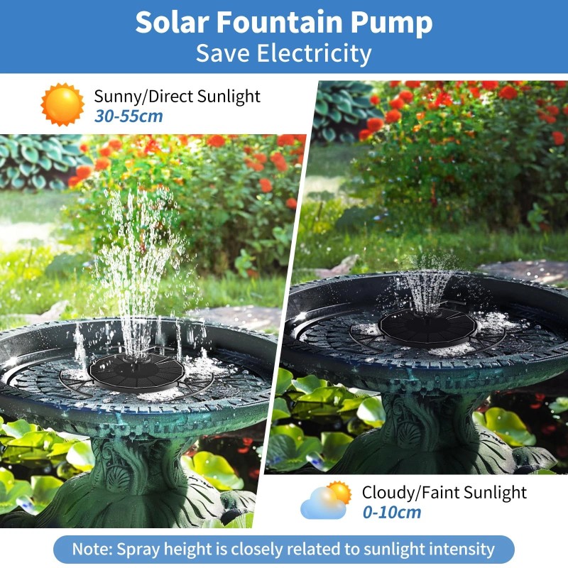 🌞Warm Tips - Be sure to use a solar fountain in clean and sufficient water. Please clean the pump regularly to prevent impurities from blocking the pump. The height of a fountain depends on the intensity of the sun. When the sun is weak, solar fountains will not function properly, and it is also important to ensure that leaves or particles blocking the solar panels are removed. It does not store any energy and will rest at night to ensure a longer lifespan.