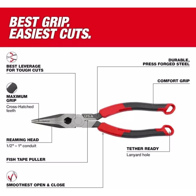 Pliers Compatible with Milwaukee MT555 8" Long Nose Comfort Grip Pliers