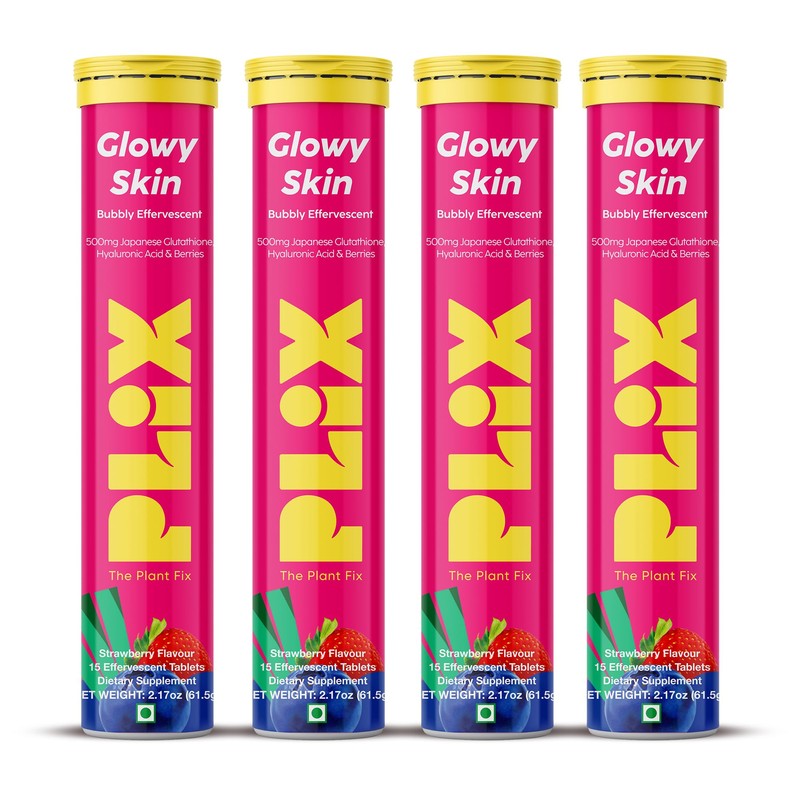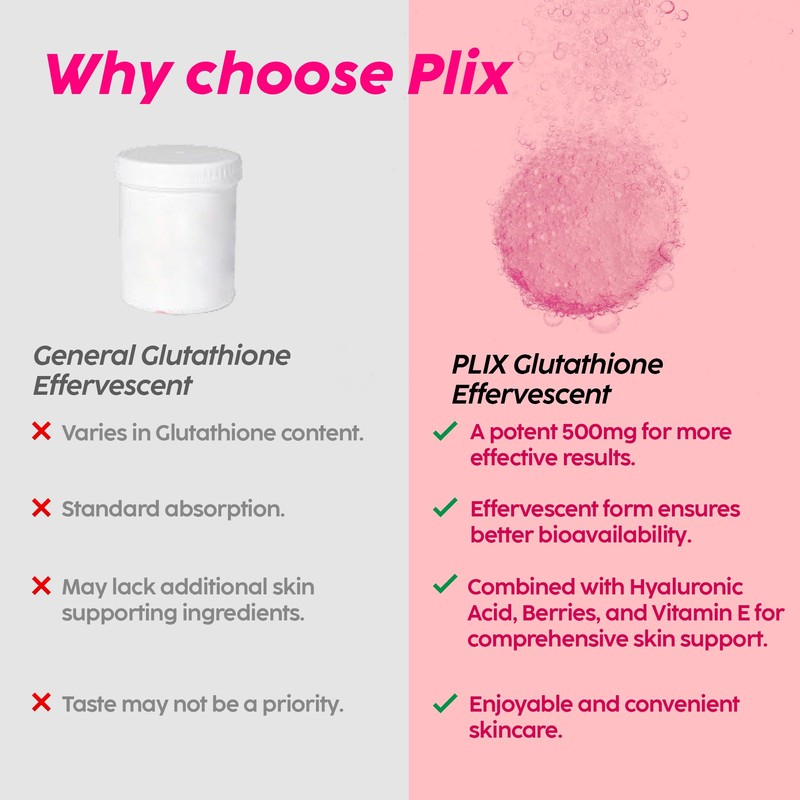 - Glow from Within: Plix Glowy Skin Bubbly Effervescent tablets contains 500 mg of Glutathione, sourced from Japan. Explore the potential benefits of reduced melanin and resisting free radicals for a radiant skin glow.