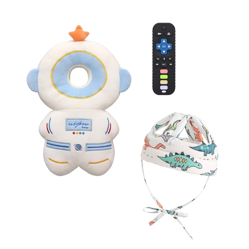PLOVZ Baby Head Protector Backpack Head Protection Pillow, Baby Helmet for Crawling Walking and Baby Teething Toys 3Pcs Set(White Astronaut)