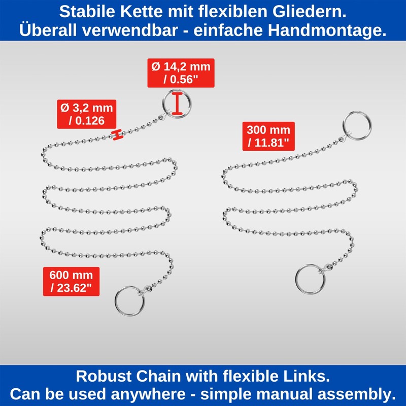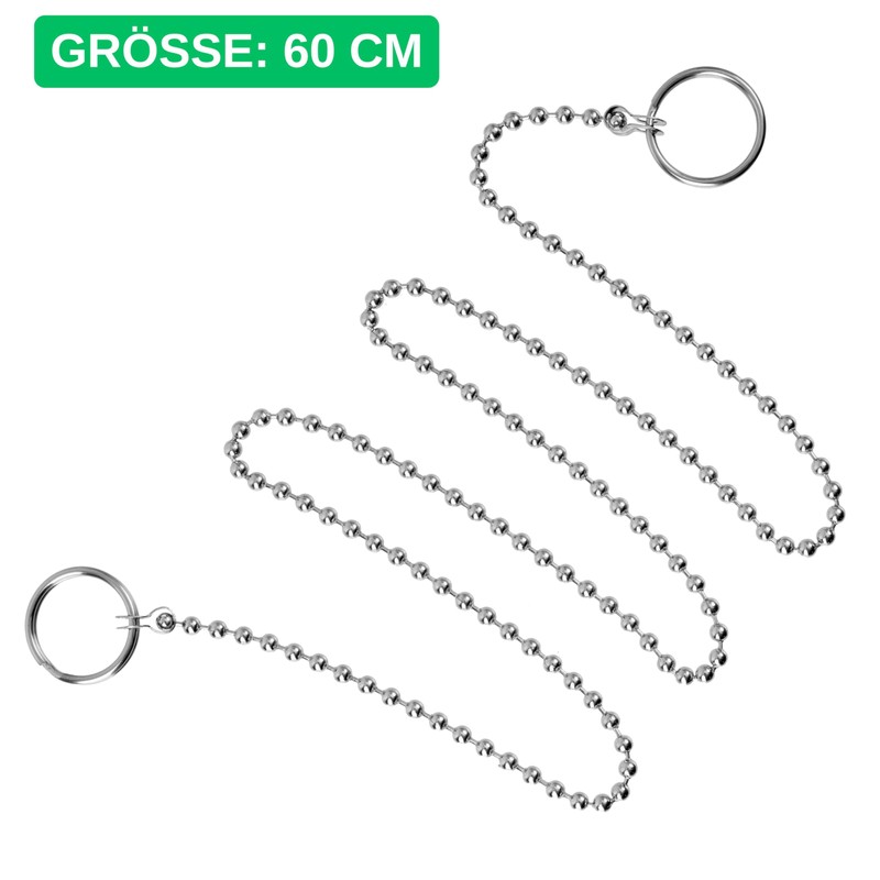 - 2 x plug chain with round ring hook, 60 cm chain length, 1.42 cm ring diameter, ball chain with diameter 3.2 mm diameter, drain plug chain made of SS.304 stainless steel, catch chain for plugs
