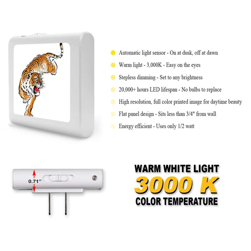 - ADJUSTABLE BRIGHTNESS - Our LED night light features a stepless adjustment slider to adjust the brightness from 0 LM to 15 LM. You’re able to set your desired brightness for different occasions to provide the best lighting experience. Beautifully printed Year of the Tiger image.