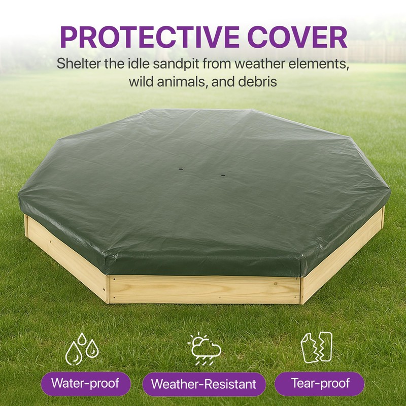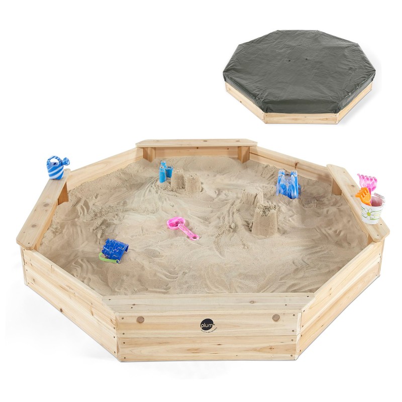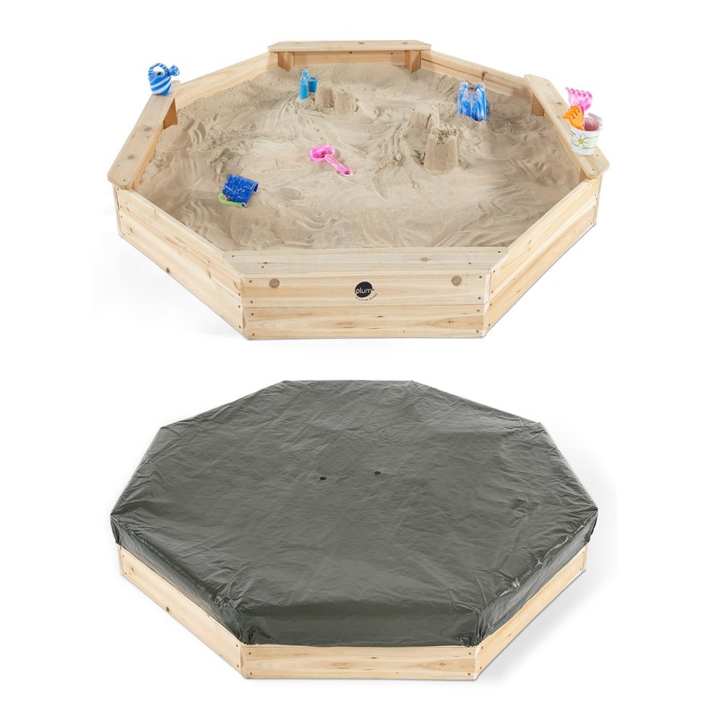 Plum Wooden Large Sandbox with Cover - Outdoor Octagon Sand Box for Kids, Toddler Sensory Toys, Outdoor Wooden Sand Pit with Seat Boards and Bottom Liner, Weatherproof, Easy Assembly, Ages 3+ Years