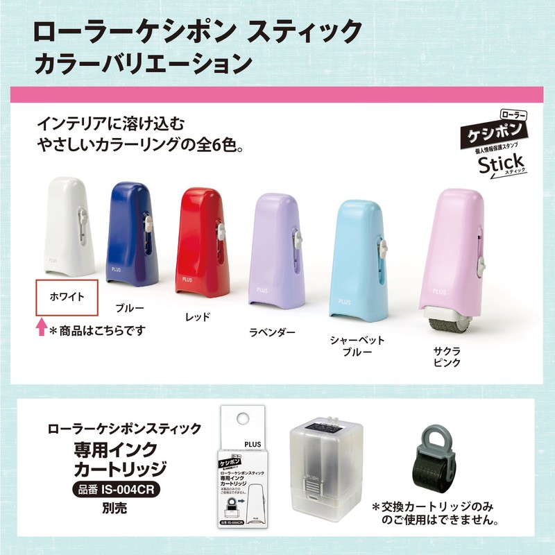 - A stick-type “Roller Keshipon” that is slim and easy to carry. The stamp allows you to protect important personal information from others.