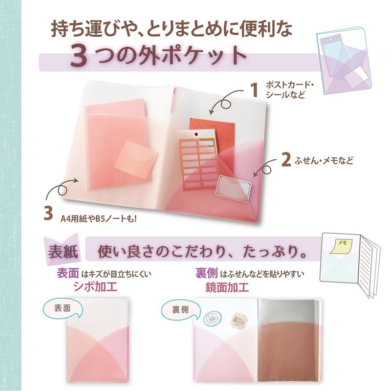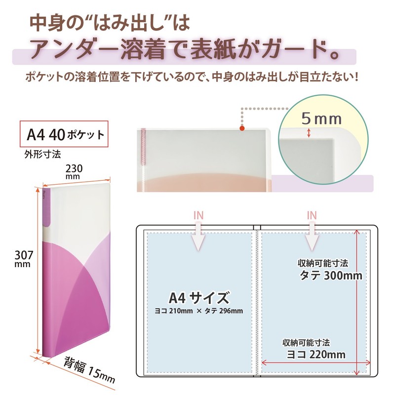 - Pocket Design: The embossing of the film is stronger than conventional and the pockets are easier to open. In addition, the inside pocket is 0.2 inches (5 mm) lower than the cover so that the documents will be protected from the cover when they come out