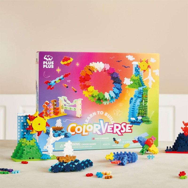 - 1000-piece construction children: discover the essence of the world of Plus Plus with the Learn to Build Colorverse Superset. With 17 amazing different colours, this is our most colourful set. In addition to the children's building blocks, the set also includes 6 base plates and 10 wheels, so children can create creative constructions.