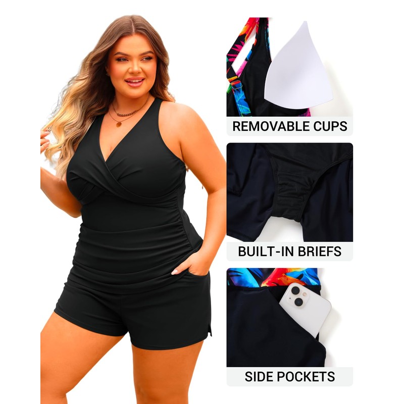 Plus Size Tankini Swimsuit for Women - Two Piece Tummy Control Bathing Suit Tankini Top with Two Pockets Shorts Black 20 Plus
