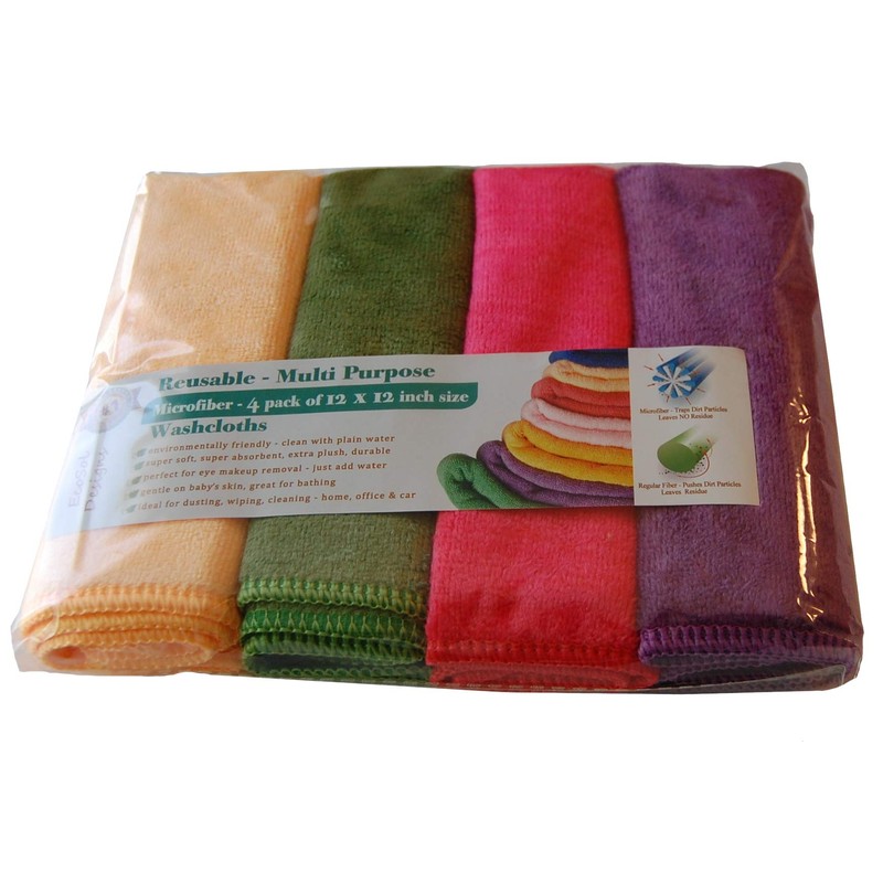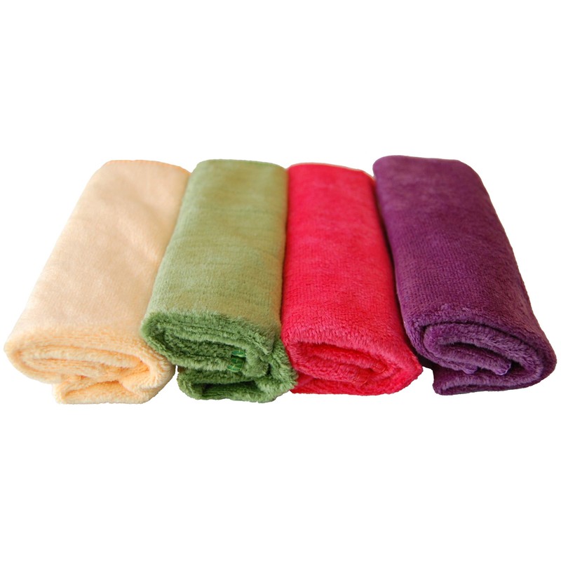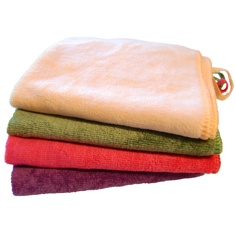 Four ultra fluffy velour microfiber towels/washcloths in four colors. Each can be used for different purpose. Ideal to effectively remove makeup and thoroughly exfoliate the whole body. Also outstanding house and car cleaning performance. Completely wipe dust and dirt, rinse easily and get softer with each wash. Can be machine washed with mild detergent, tumble dry low or air dry. No bleach, no fabric softener. Best if washed with other microfiber materials as linting fabrics (including cotton) can clog the microfibers and reduce their effectiveness.
