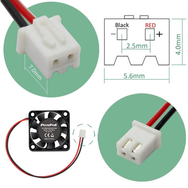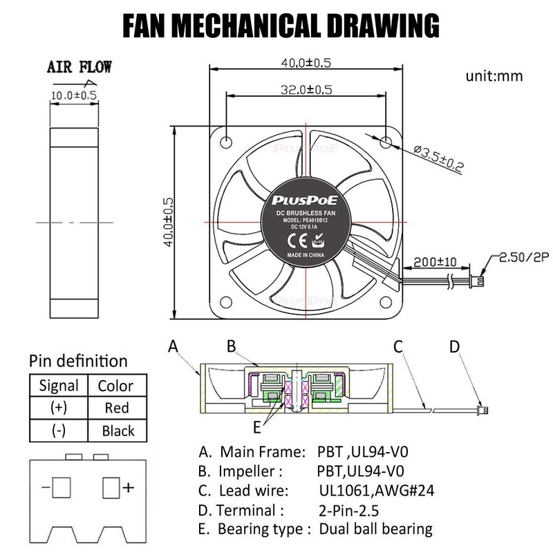 - DC Brushless Cooling Fan, Rated Voltage: DC 12V, Current: 0.06A; Dimensions: 40x40x10mm (1.6 x 1.6 x 0.36inch)