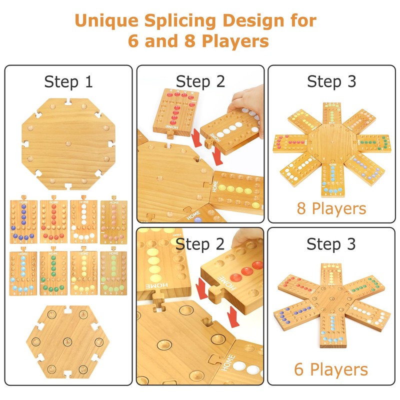- 【Splicing design for easily storing and Carrying】Enjoy hassle-free fun with Plusvivo's unique Splicing Marble Board Game! It is easy to assemble and takes only a few seconds to get a complete marble game board for 6 or 8 players. When you finish the game, it can be easily disassembled and stored into a small box for travel, or storage. Perfect for camping trips and family game night!