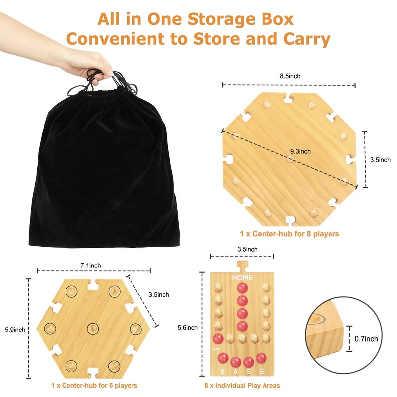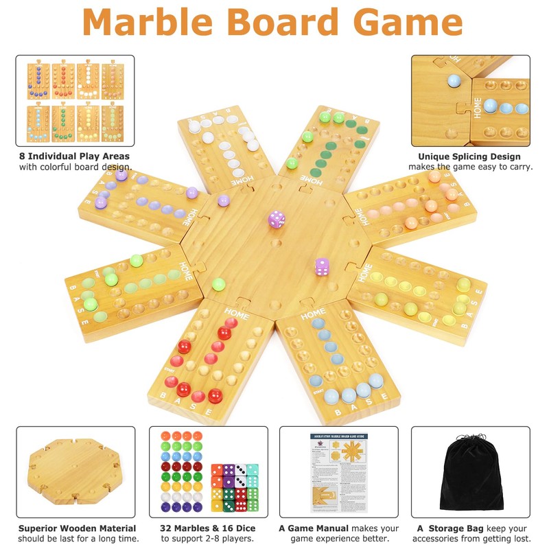 - 【Luxurious Marble Board Game Set】Made from high-quality wood with a 8-color painted design and text instructions for easy navigation from start to finish. The marble board game comes with 32 Marbles 16 Dice, and a velvet storage bag. The wooden game board can be assembled according to the number of players. Comes with detailed instructions so newbies can master the game in minutes and join the fun!