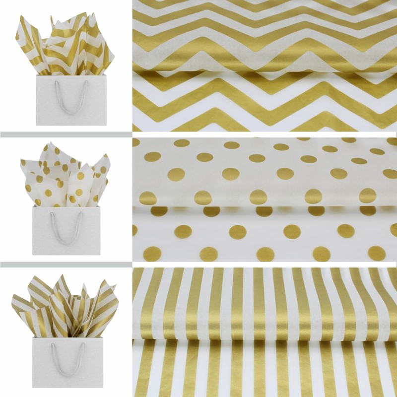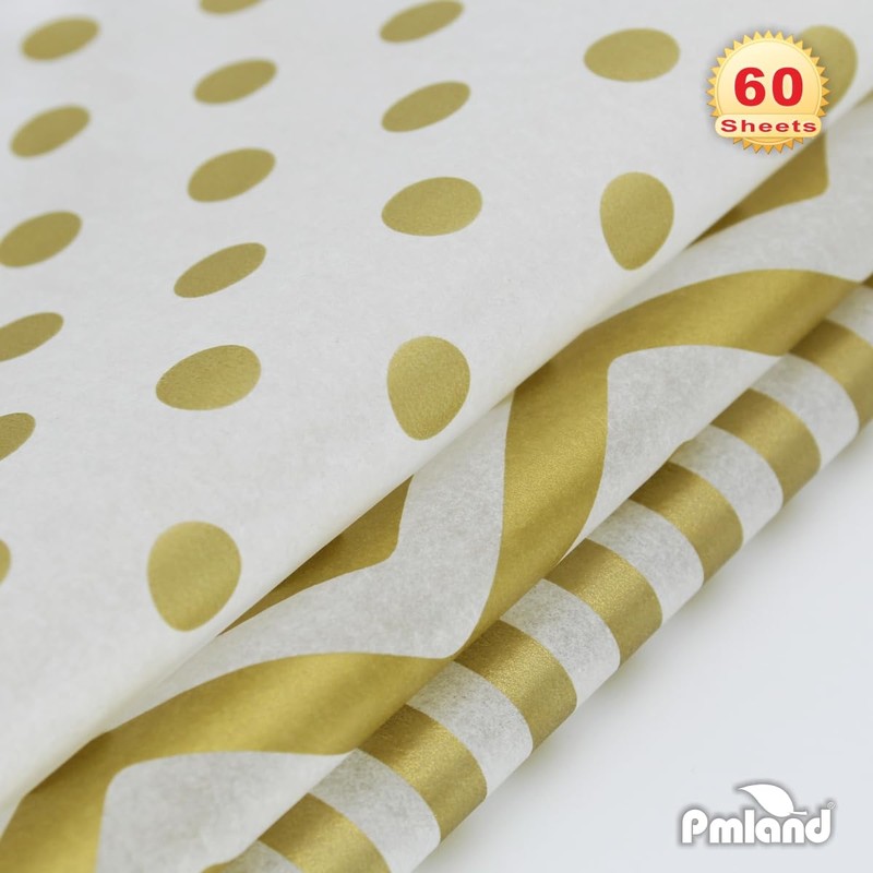 PMLAND Premium Gift Wrapping Tissue Paper - White Metallic Gold Dot Stripe Zigzag Multi - 20 x 14 Inches - 60 Sheets