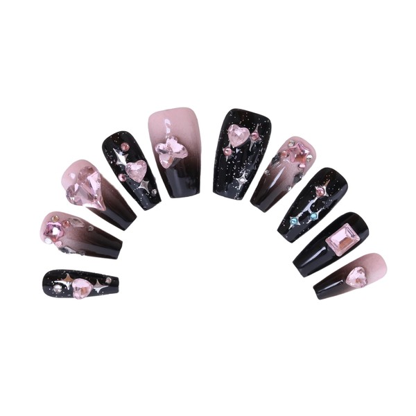 PN-006 Press-On Nails Varnished 10 Pieces Reusable False Nails Y2K Glamour Heart Rhinestones Pink Black