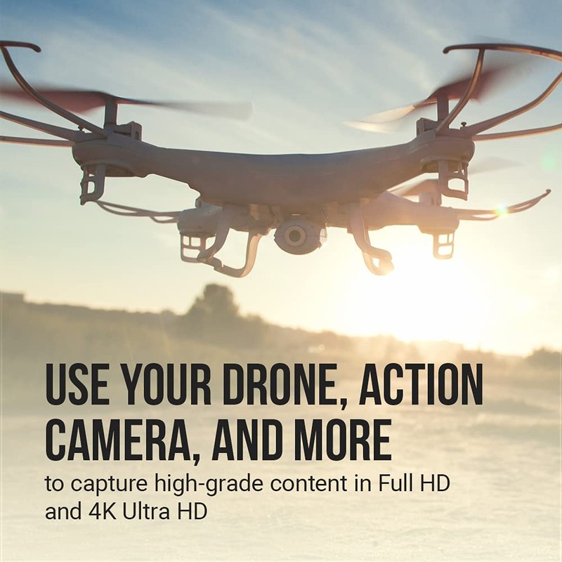 - Graba y transfiere videos, fotos, música, archivos y más desde dispositivos host habilitados para microSD como smartphones y tabletas Android, cámaras de acción y vigilancia, drones, computadoras y mucho más