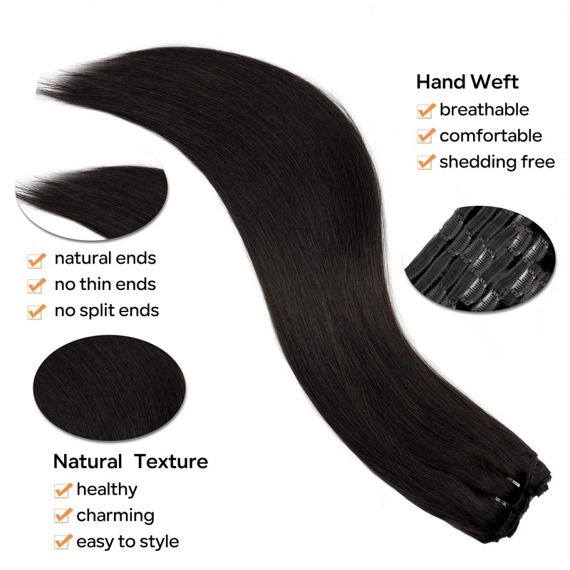 - 【High Quality】Jet Black clip in hair extensions are made of 100% unprocessed virgin hair, which can blend perfectly without cornrows, silk and smooth, can be strengthened, curled, dyed, like your own hair!