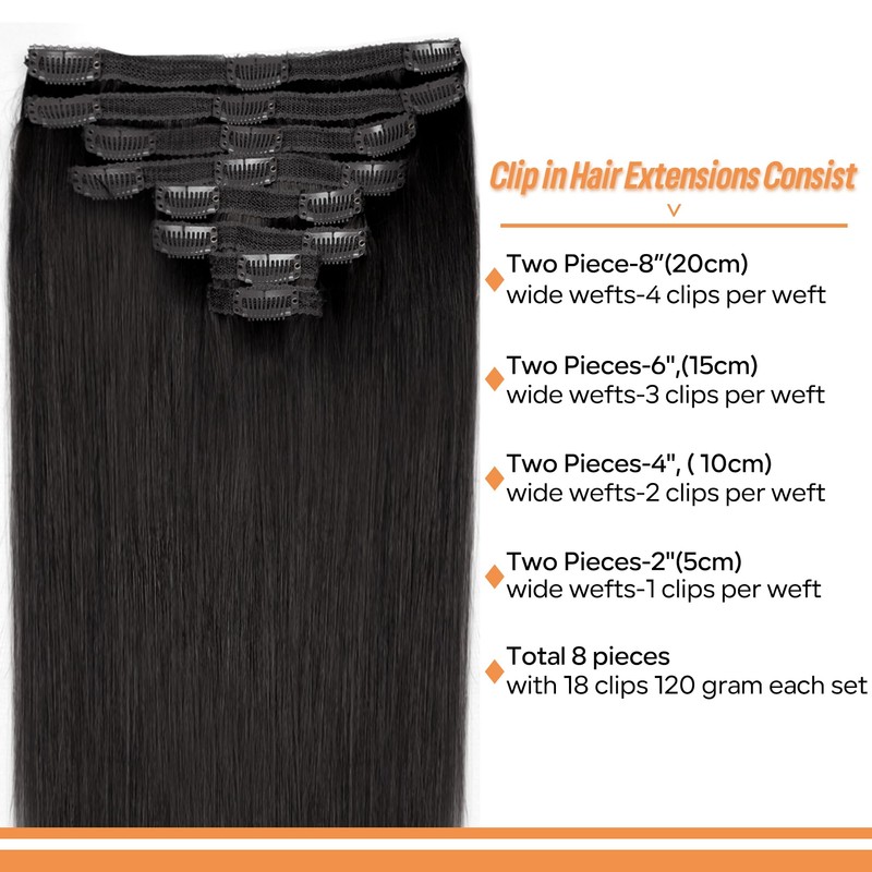 - 【A Set of 8 Piece & Tips】Pobokix clip in hair extensions real human hair , 8 pieces 120g with 18 clips per set. Usually 2 sets is recommended to make a full head to add hair length and volume, 3 sets are suggested if you want thicker