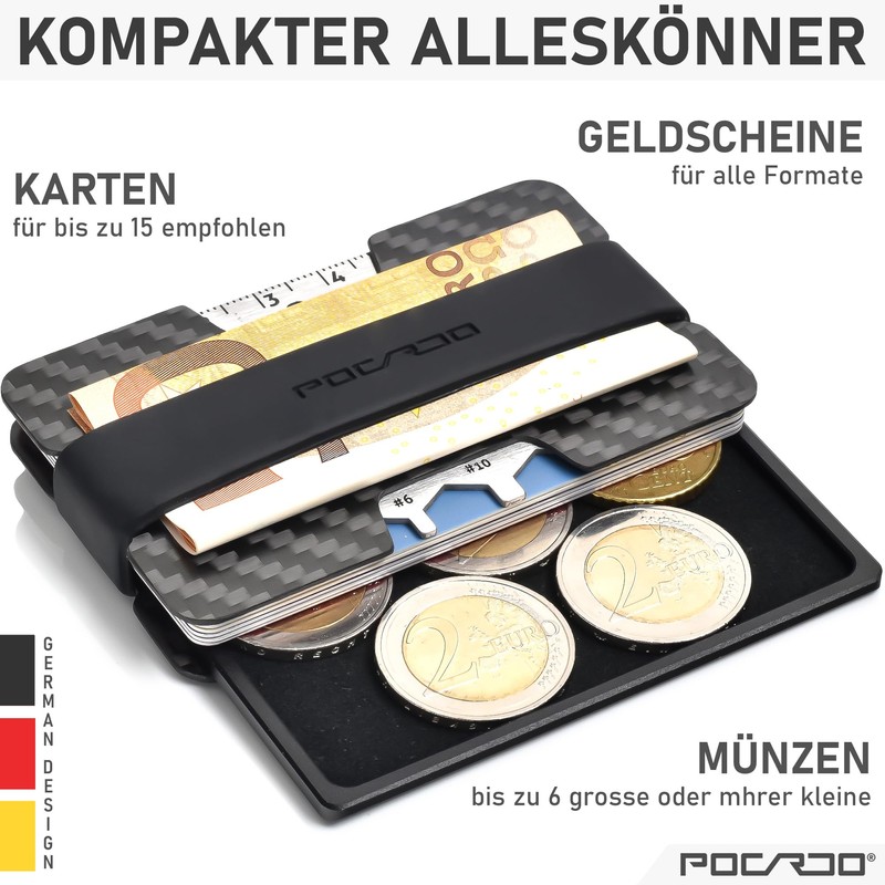 - ✔ Flexible: the card holder offers space for up to 20 cards and several banknotes. Thanks to high-quality 3K carbon fibre, your cards remain well protected.