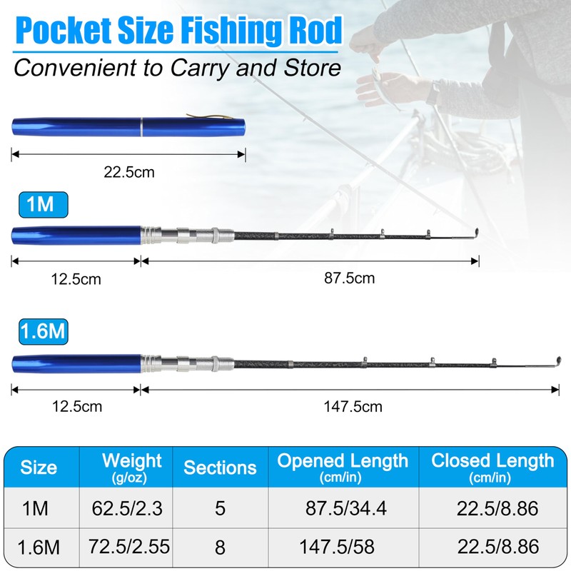 - đăTelescoping Fishing RodsăHigh stiffness fiberglass fishing rod with ultra-sensitive contraction. 1M: 5 sections, folded length 8.8in, opened length is about 39in. 1.6M: 8 sections, folded length 8.8in, opened length is about 63in. Easy to carry for fishing outings.