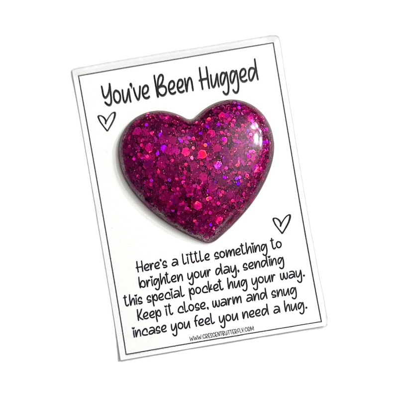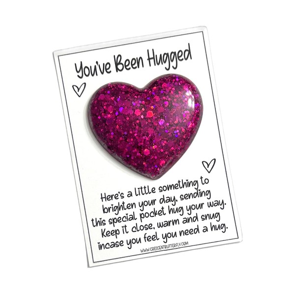 - Glitter Resin Heart! (NOT sticker on back) MATERIAL: High-quality Resin SIZE: Approximately 2” x 1.6” PACKAGE INCLUDES: 1x You’ve Been Hugged-Pocket Hug w/ Card