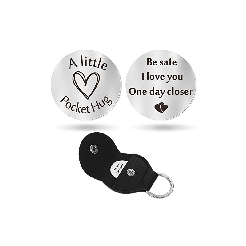 Pocket Hug Token Long Distance Relationship Keepsake Stainless Steel Double Sided Inspirational Gift with PU Leather Keychain (Be Safe)