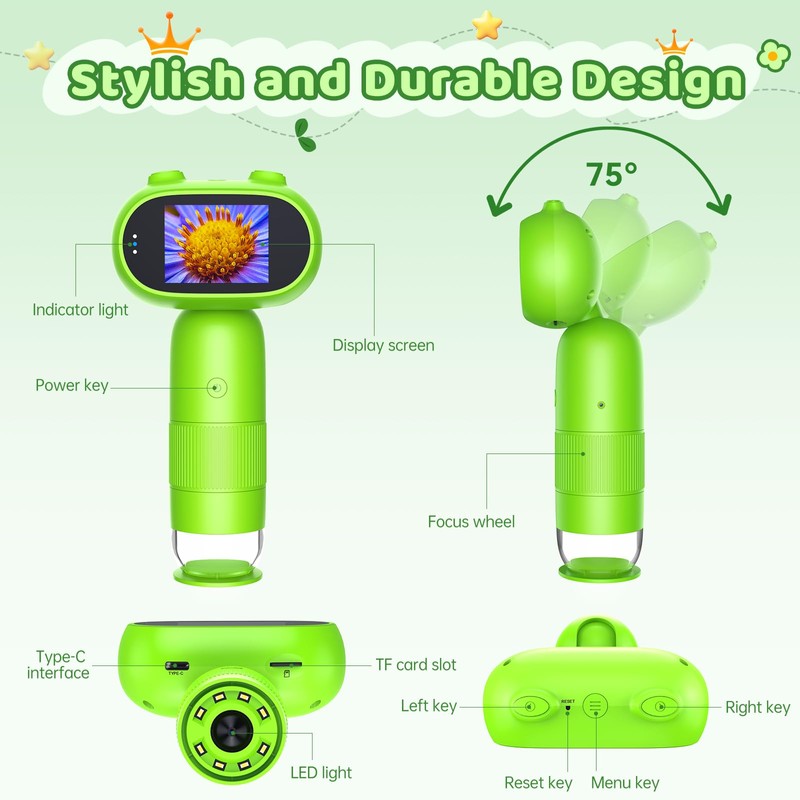 - Stylish and Durable Design:Designed with both aesthetics and functionality in mind, this handheld microscope features a stylish look that appeals to children while remaining durable for everyday use. The adjustable components allow kids to find the perfect angle for observation, enhancing their comfort and making the experience more enjoyable