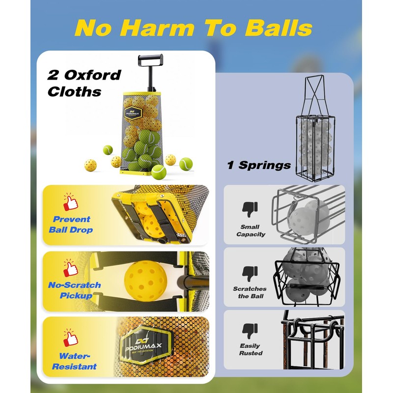 - 600D Oxford Cloths, Efficient Pickup: Equipped with two tough nylon pickers, Tennis ball pickup protects your pickleballs and tennis balls from scuffs and adds extra grip, so you can pick balls up effortlessly, even on sand or sloped ground, with no debris picked up. Just clean and easy pickup