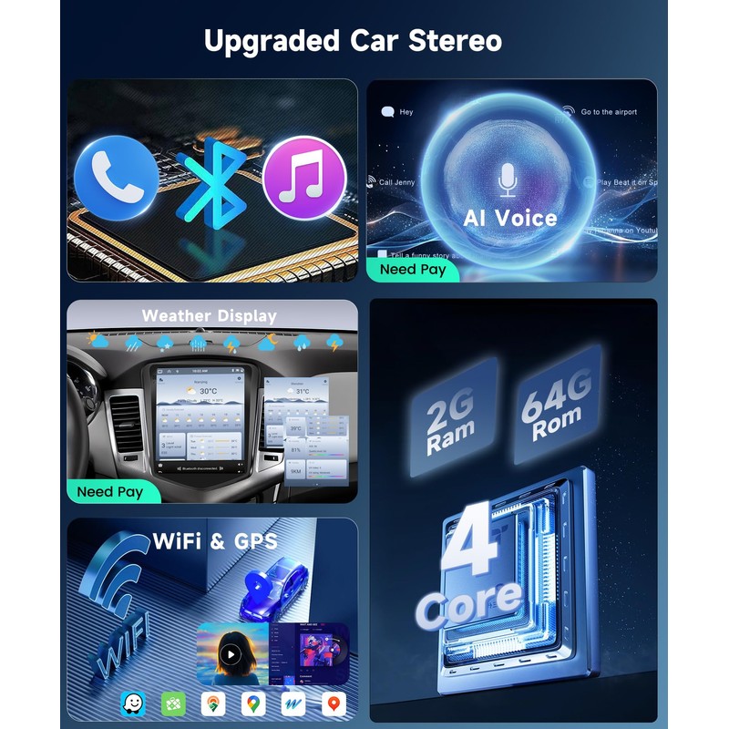- 2.【Android Car Stereo & WiFi GPS & AI Voice】 Carrying upgraded Android system,4-core CPU,2G RAM & 64G ROM,proving you smoother experience and faster response with 9.7 inch 1080P Touchscreen.Connected with WiFi,You could download various Apps such as Waze,Spotify,Google Maps etc. as well as update offline maps.AI Voice control:Podofo assistance enables you drive more attentively.Podofo stay with you all the way