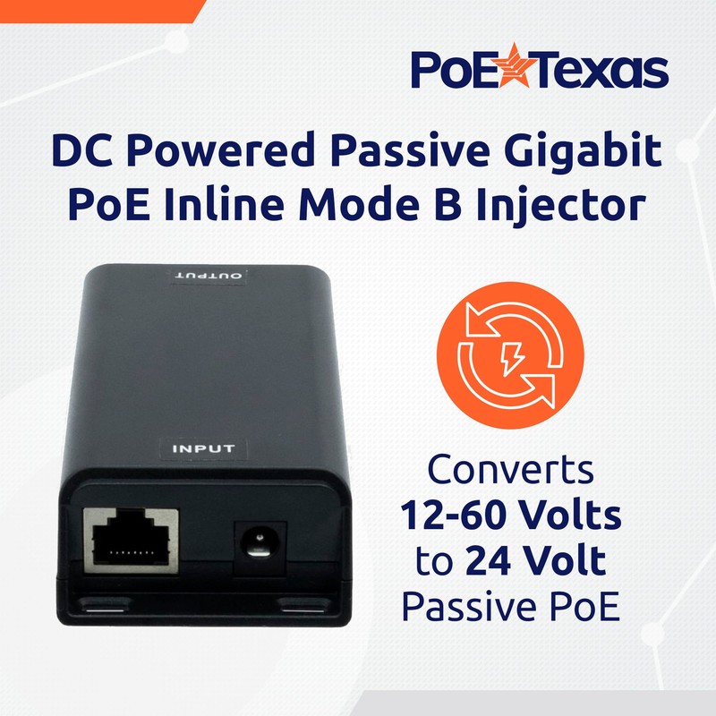 PoE Texas 24 Volt Passive PoE Injector (Mode B) - DC-Powered Gigabit Inline Converts 12-60V in to 24 Volt Passive PoE Out Up to 30 Watts - Variable DC PoE Injector for Solar Powered Installations