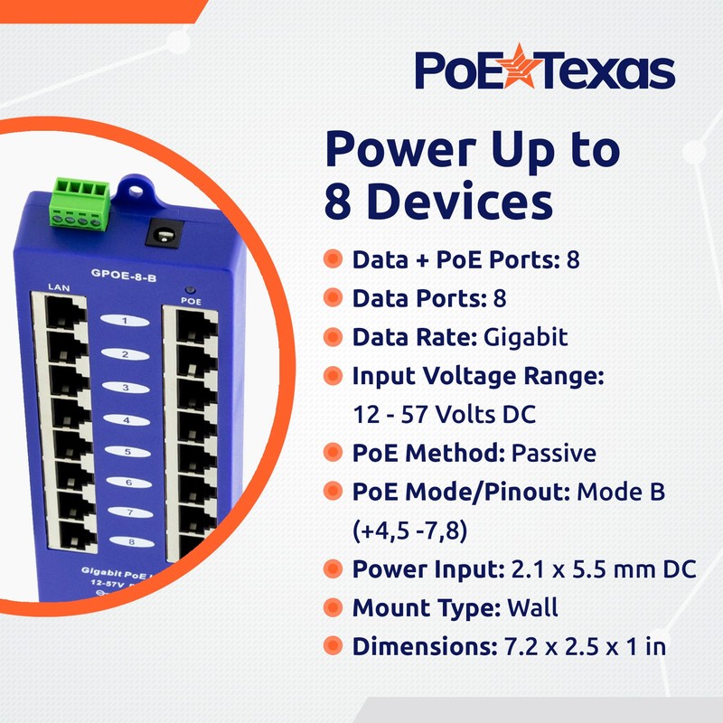 PoE Texas GPOE-8B - 8 Port PoE Injector - Gigabit Passive Mode B Power Over Ethernet Injector for Ubiquiti, Mikrotik & More - Add PoE to A Non-PoE Switch - 24v, 48v or 56v Power Supply Sold Separately