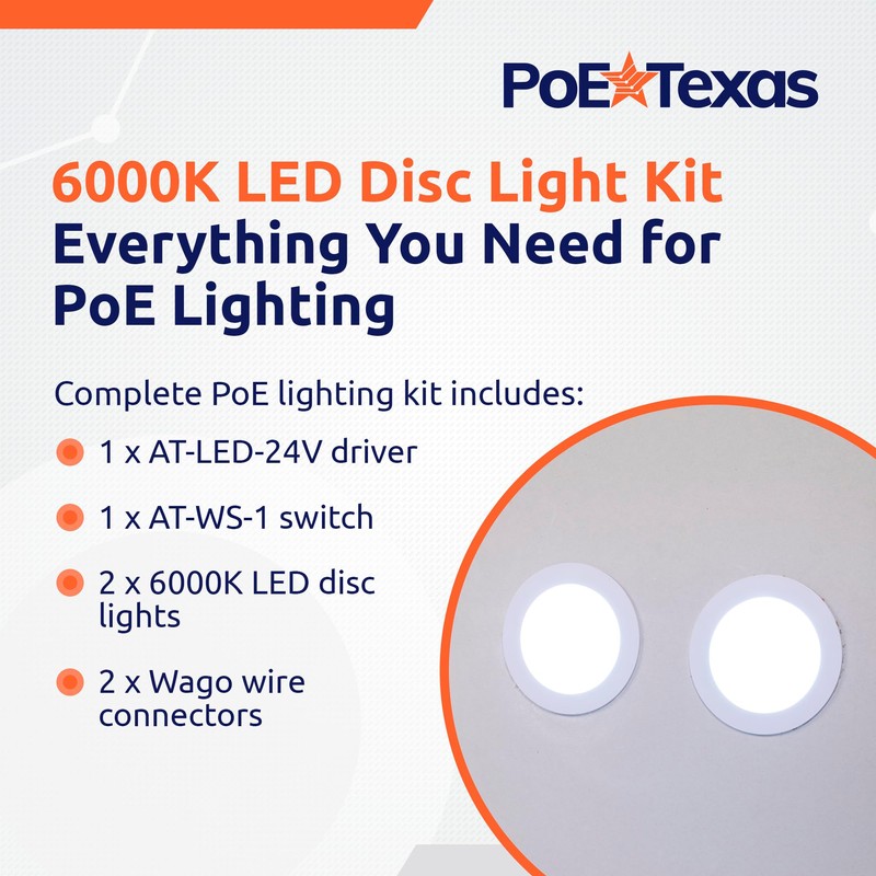 • PoE Texas has made PoE Lighting simple and affordable with the AT-LED-24V driver. Use a PoE+ Switch or Injector and this kit to add two high-output LED disc light ceiling fixtures to any room. No programming, no complex wiring. Just plug and play.