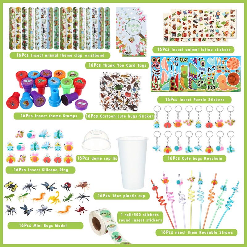 - Versatile Party Pack: this comprehensive insects party favors pack includes 16 units each of a variety of entertaining elements such as animal tattoo stickers, animal keychains for kids, straws, kids' stamps, lidded cups, animal slap bracelets, thank you cards, puzzle stickers, PVC rings, and animal miniatures, topped off with a wire roll, an animal sticker pack, and a roll of round stickers; A nice addition to any party ensuring a fun filled experience for you