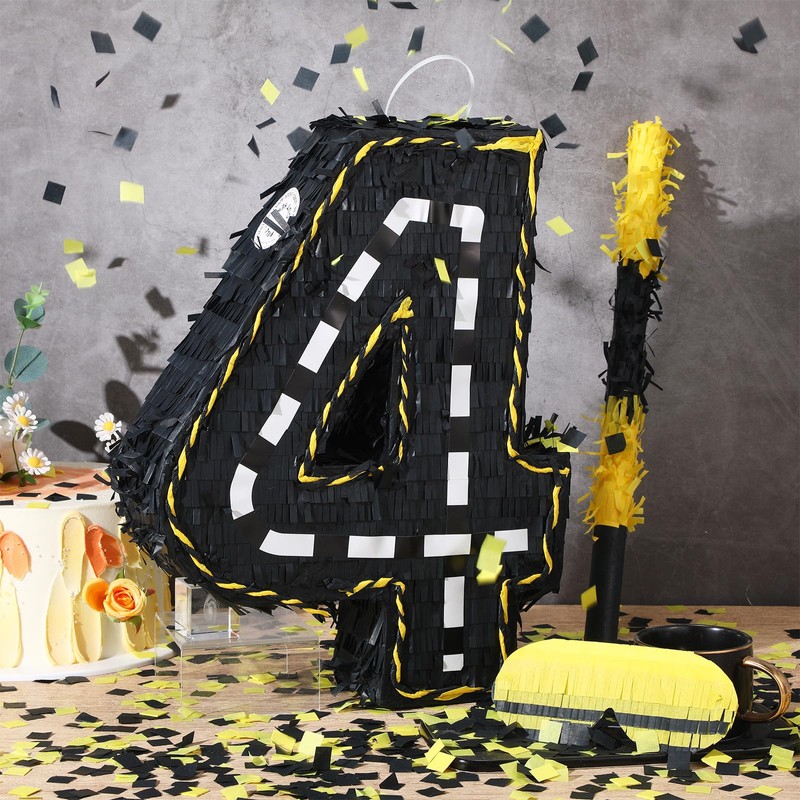 - Innovative Architectural Design: crafted from sturdy cardboard to withstand multiple impacts, our digital 4 Piñata features a black 3D digital 4 exterior design with black and white lines in the middle of the road and yellow and black police tape at the edge, which is delicate and eye-catching, easily attracting everyone's attention and enhancing the party atmosphere