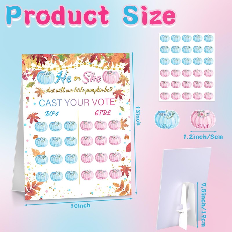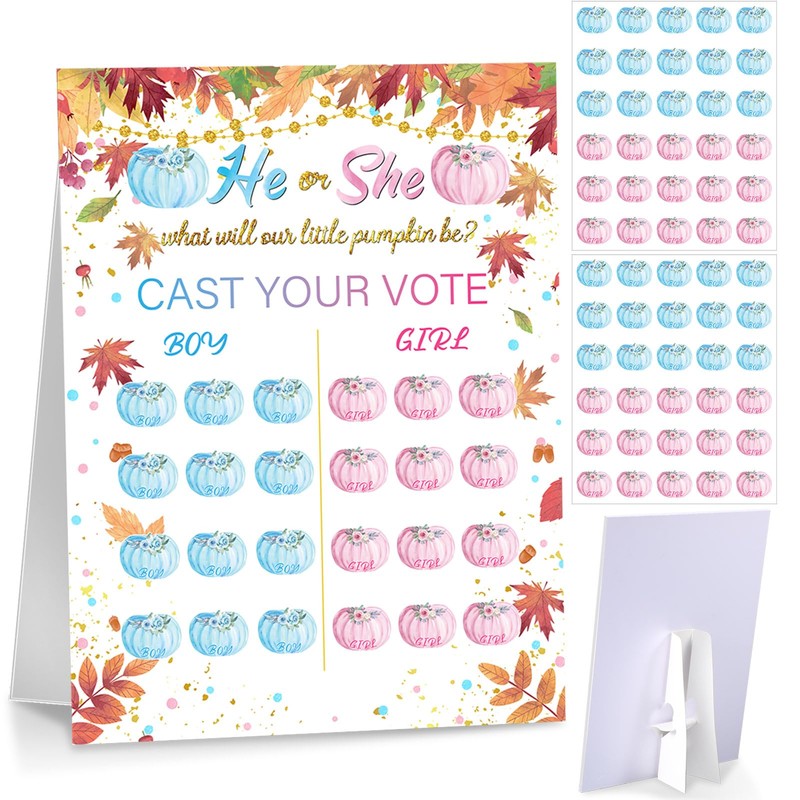 - Fall Gender Reveal Game Kit: you will get a gender reveal voting board sign with stand, 30 pieces of pink pumpkin voting stickers and 30 pieces of blue pumpkin voting stickers, for team boy team girl gender reveal; The sufficient quantity is enough for guests attending to make a guess