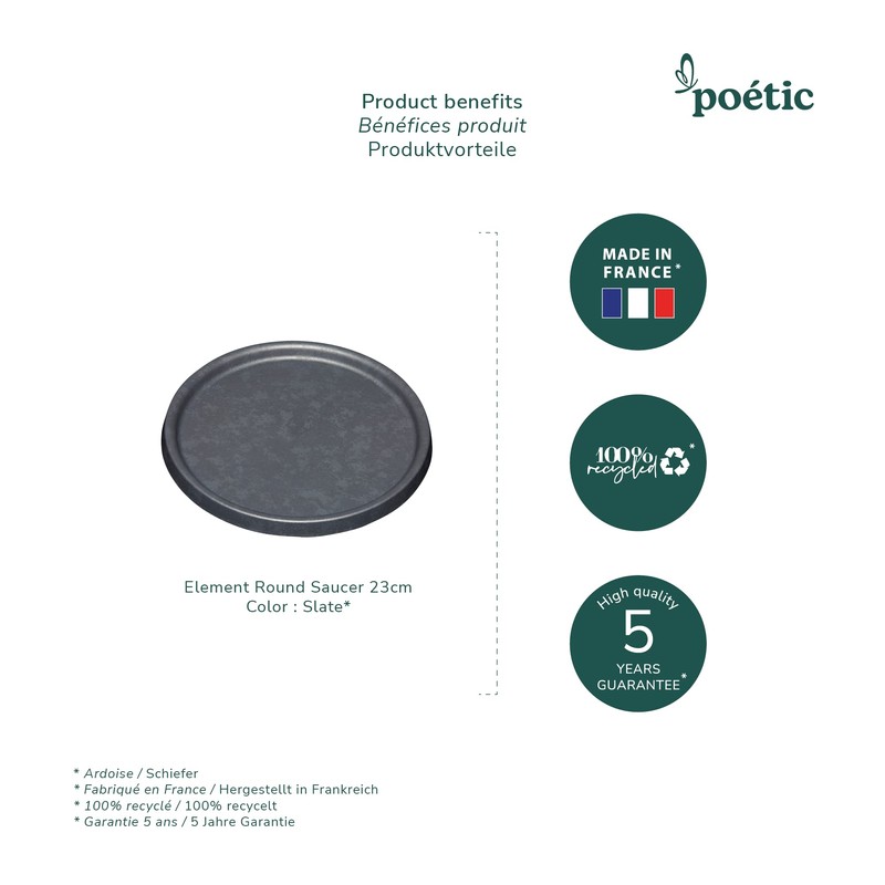 Poetic - Flower Pot Saucer - Round Saucer for Indoor and Outdoor Use - Slate Colour - 23.2 x H. 1.6 cm - Made of Recycled Plastic