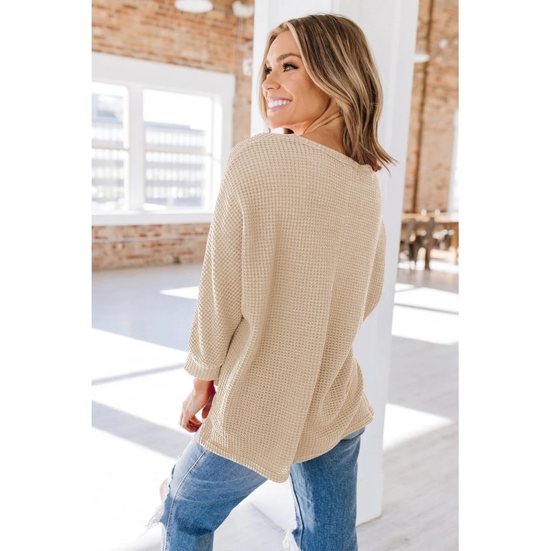 Poetsky Womens Casual Tunic Tops with Elbow Length Sleeves Crew Neck Waffle Knitted Shirts Oversized Long Pullover Sweater with Slits Apricot S