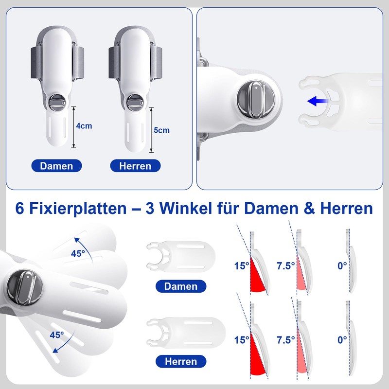 - [Professioneller Hallux Valgus Korrektor für unterschiedliche Fußgrößen]: Unser Korrektor enthält 6 Fixierplatten mit drei Korrekturwinkeln (0°, 7,5°, 15°), jeweils 3 für Damen (4 cm, Größe 35–40) und 3 für Herren (5 cm, Größe 41–46). Anders als bei vielen Anbietern, die nur eine gemeinsame Einheitsgröße für Damen und Herren anbieten, sorgen unsere Platten für optimalen Sitz, Komfort und Korrektur nach Schweregrad